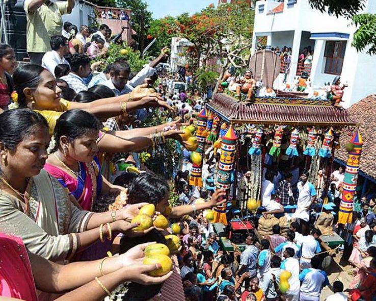 The festivals occurred at the Vedapureeswarar sanctuary here on Tuesday. The Mangani celebration is praised on the full moon day in the Tamil month of Aani. A chariot enriched with mangoes was taken in parade around the sanctuary and mangoes and rava kesari were circulated to all enthusiasts, the authority said.
